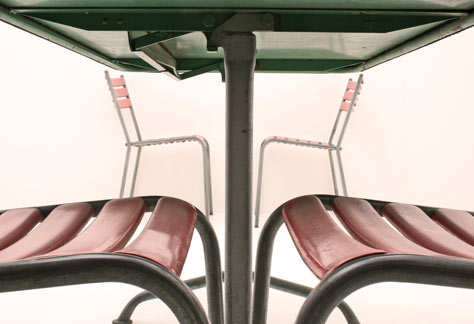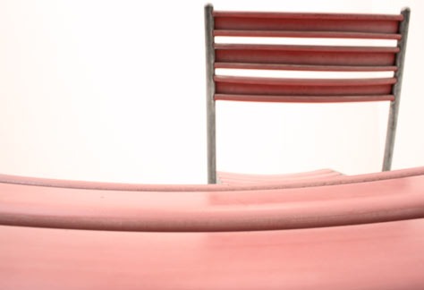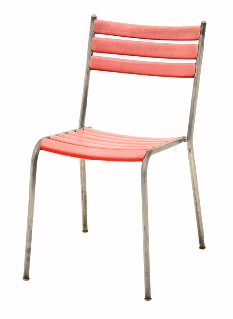 Massiver verzinkter Stahlrahmen, Latten mit rotem Kunsstoff ummantelt. Durch das Alter sind diese in eimem rosa Ton.