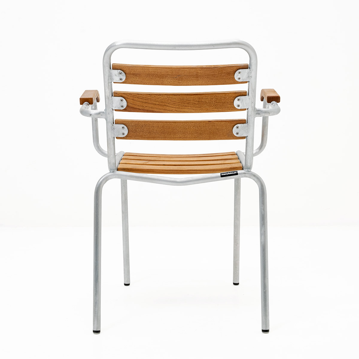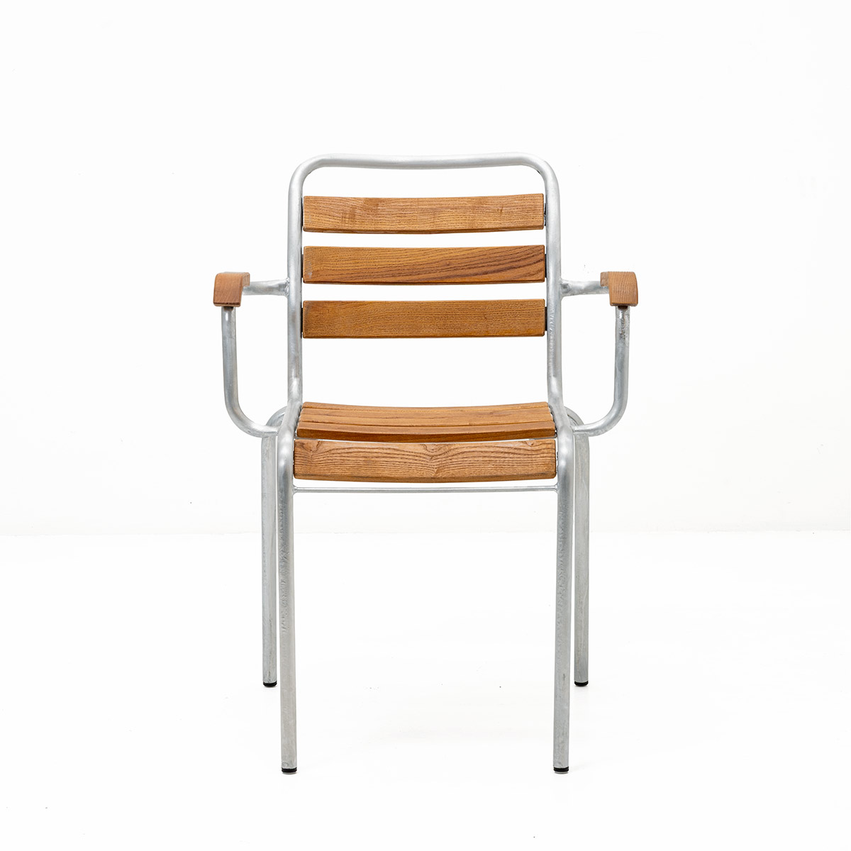 Der Bättig Gartenstuhl Klassiker in Holz-Ausführung. Verzinkter Stahlrahmen mit Eschenholzlatten.