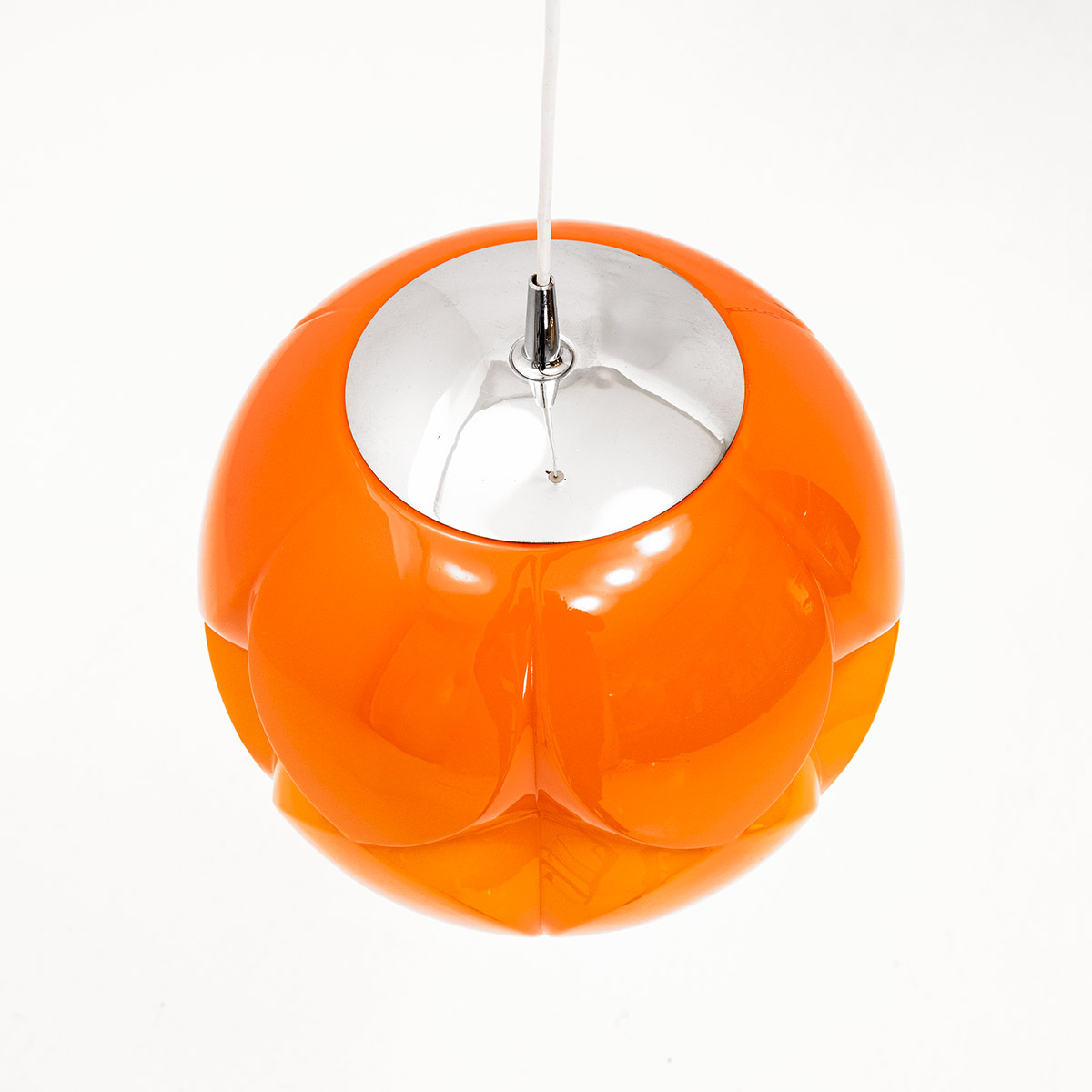 Diese hochwertige Hängelampe aus farbigem Opalglas wurde in den späten 1960er- / frühen 1970er-Jahren von Peill & Putzler in Deutschland hergestellt. Der skulpturale orangefarbene Glaskörper ist auf der Innenseite weiss. Dieses beeindruckende modernistische Lichtobjekt spendet ein warmes, angenehmes Licht.