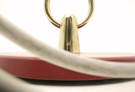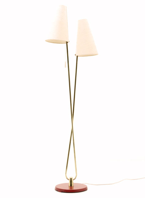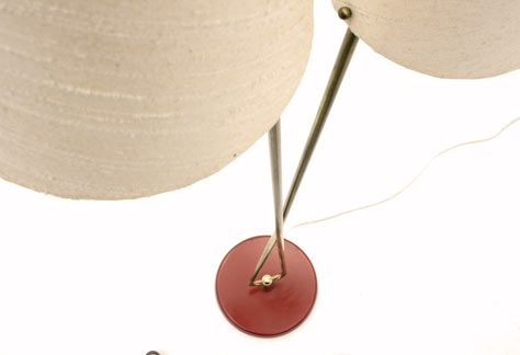 Holzsockel rot lackiert, Messigstangen und Stoffschirme.