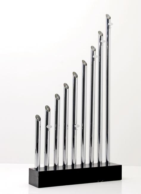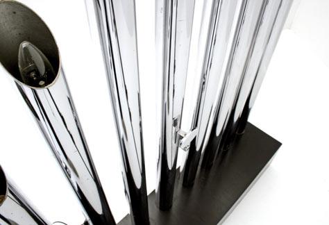 Chromestahl-Röhren mit schwarzem Holz-Sockel.