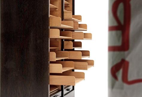 Halbhoher Schrank mit zwei vertikalen Schiebetüren, einzeln abschliessbar.