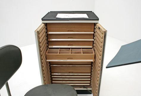 Apothekerkorpus aus Holz, weiss gestrichen, mit diversen Schubladen und Unterteilungen, Glasablage.