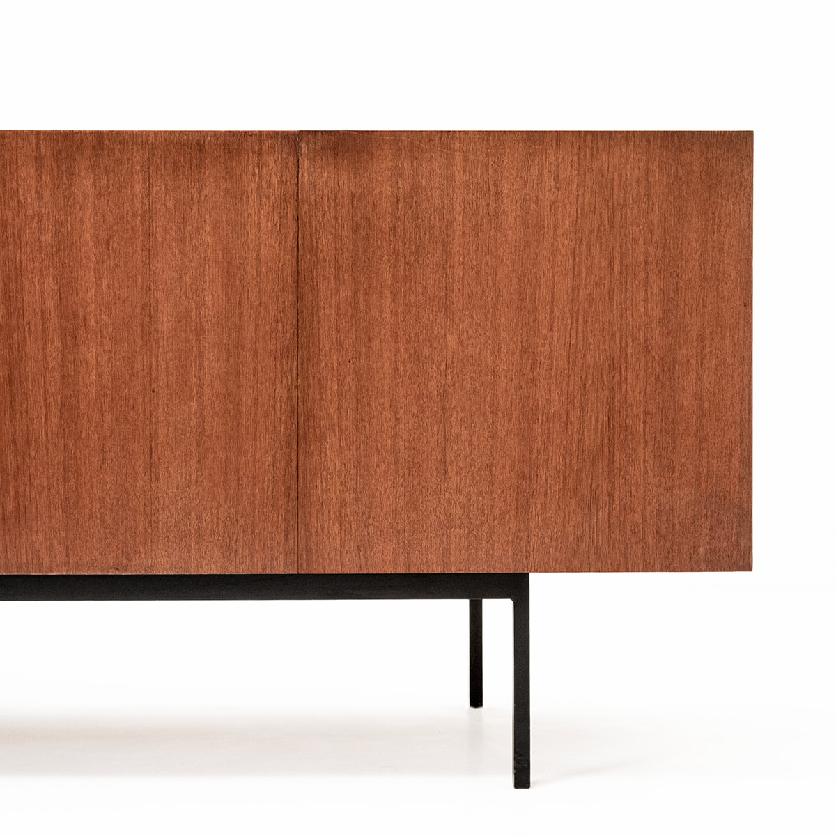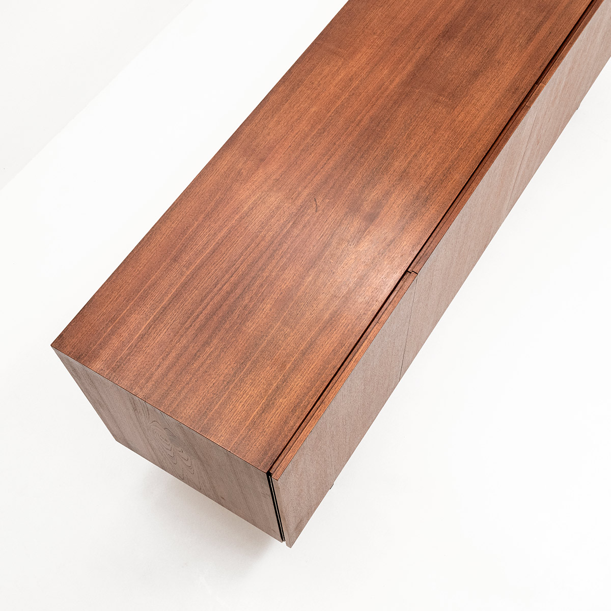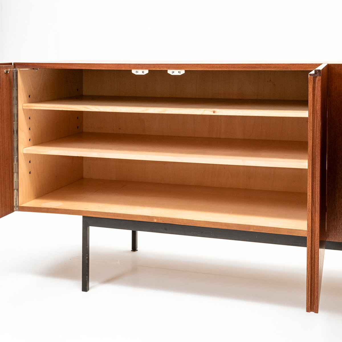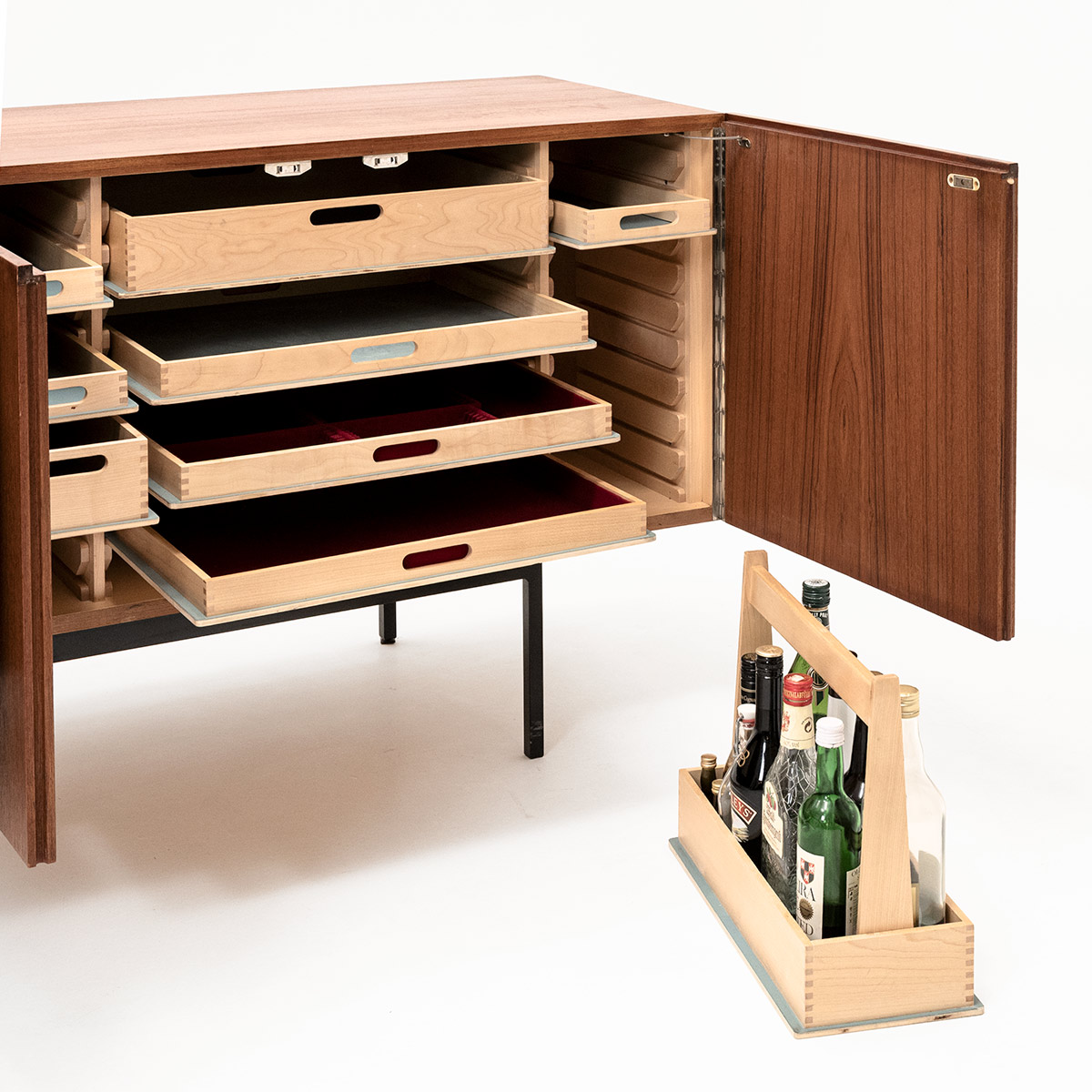 Mid-Century Sideboard von Dieter Waeckerlin. Klare Linienführung, zeitloses und stilvolles Design. Aussen mit Teak furniert, Innenausbau aus Ahorn gefertigt. Das liebevoll gestaltete Innenleben bietet nicht nur Stauraum, sondern wartet auch mit einem Flaschenhalter auf.