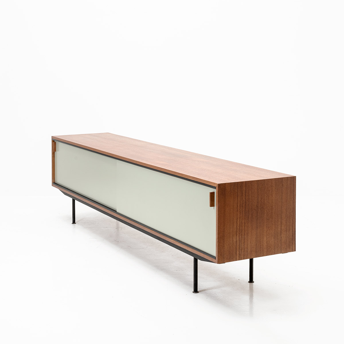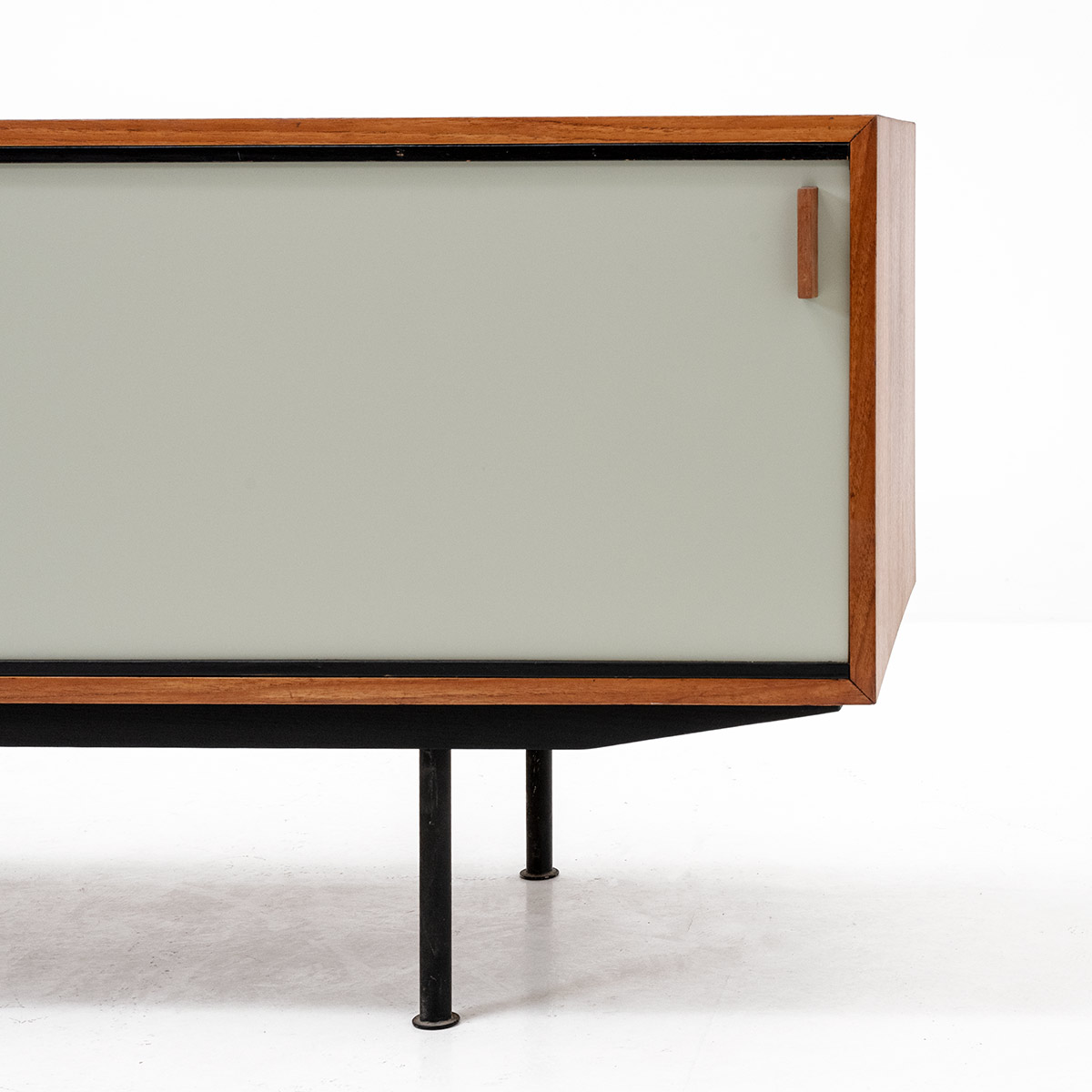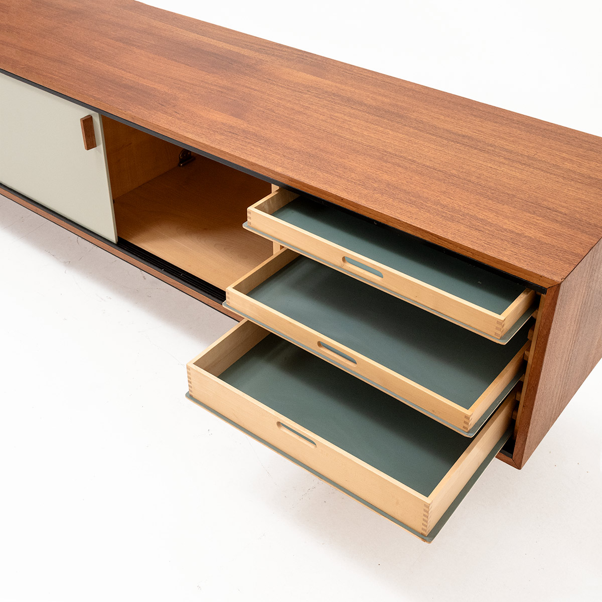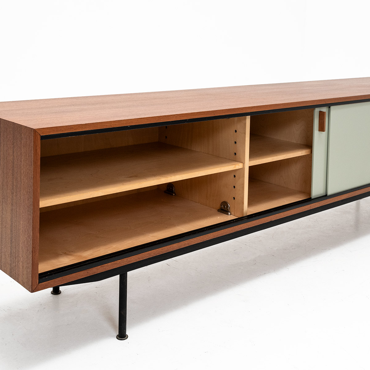 Teakholzkorpus mit schwarzen Stahlrohrbeinen. Mintfarbene Schiebetüren, frisch lackiert, harmonieren mit dem Innenleben. Ein kleines und ein grosses Tablar aus Sperrholz, drei dunkelgrüne Schubladen.