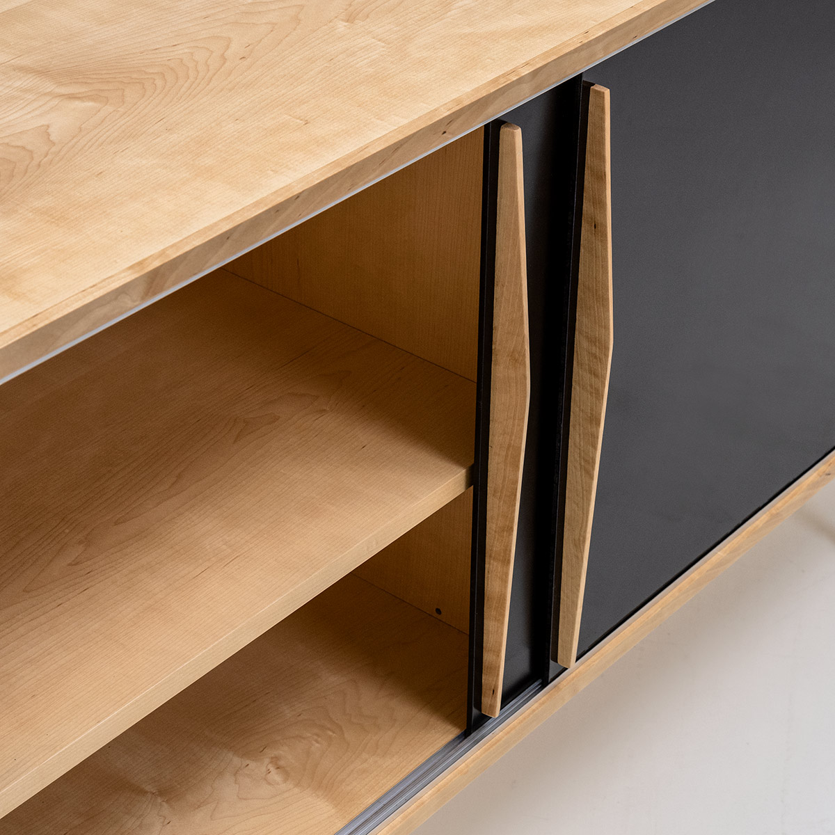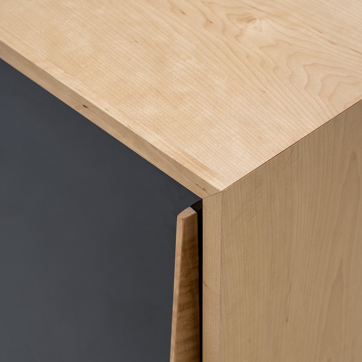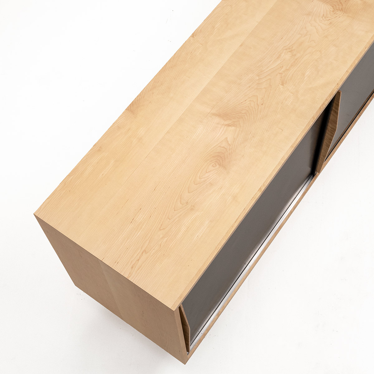 Der hochwertig verarbeitete Korpus (Stabplatte, aussen furniert in Ahorn und innen in leicht hellerem Ahorn) enthält zwei gleich grosse Fächer, die jeweils mit zwei in der Höhe justierbaren Regalböden ausgestattet sind.