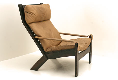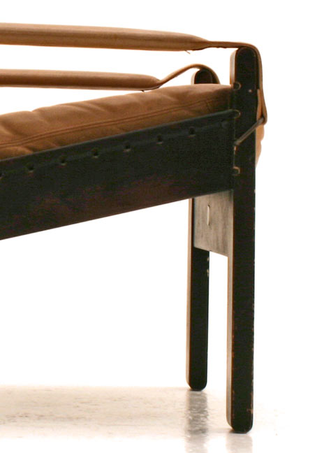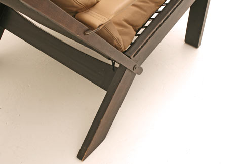 Verstellbarer Sessel. Konstruktion aus Holz. Kissen, Rindsleder. Über Armlehnen zur Liege umfunktionierbar.