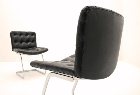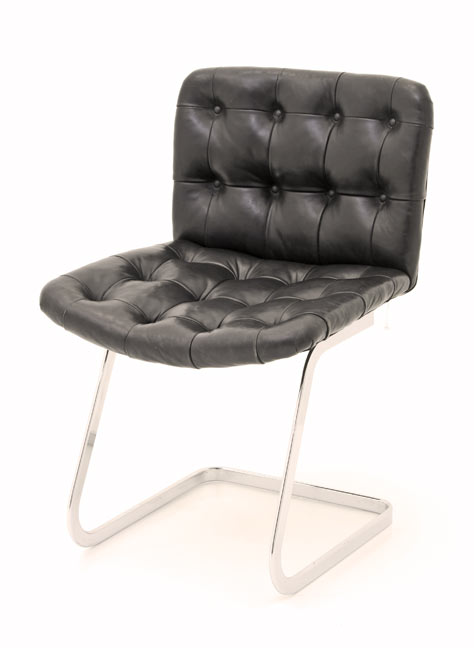 Edel verarbeitete Stühle, schwarzes Leder, kapitoniert, auf Chromstahlkuven.