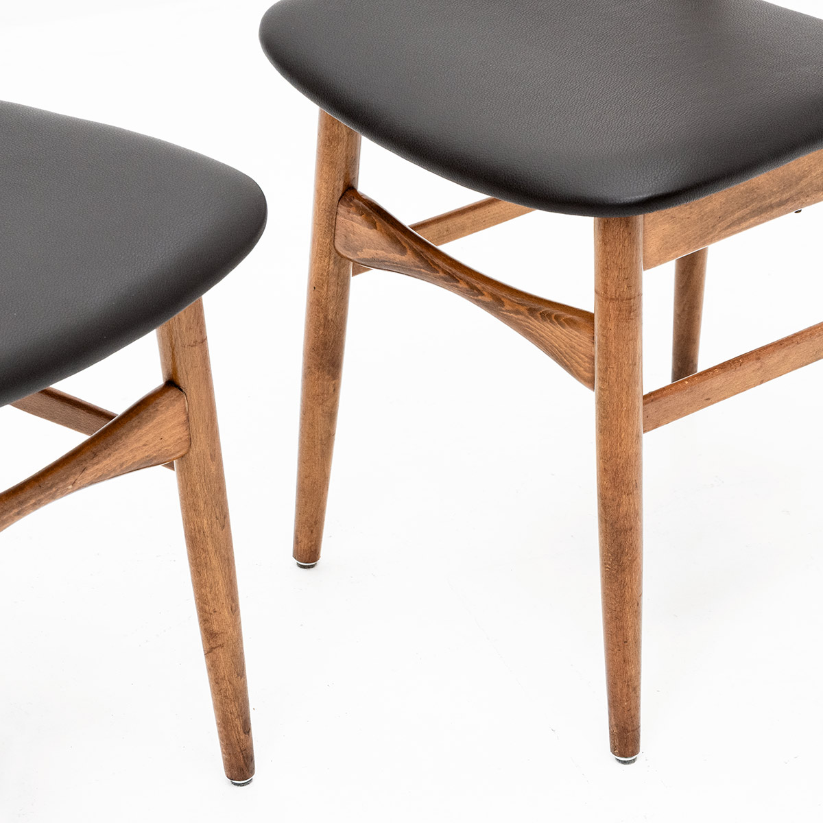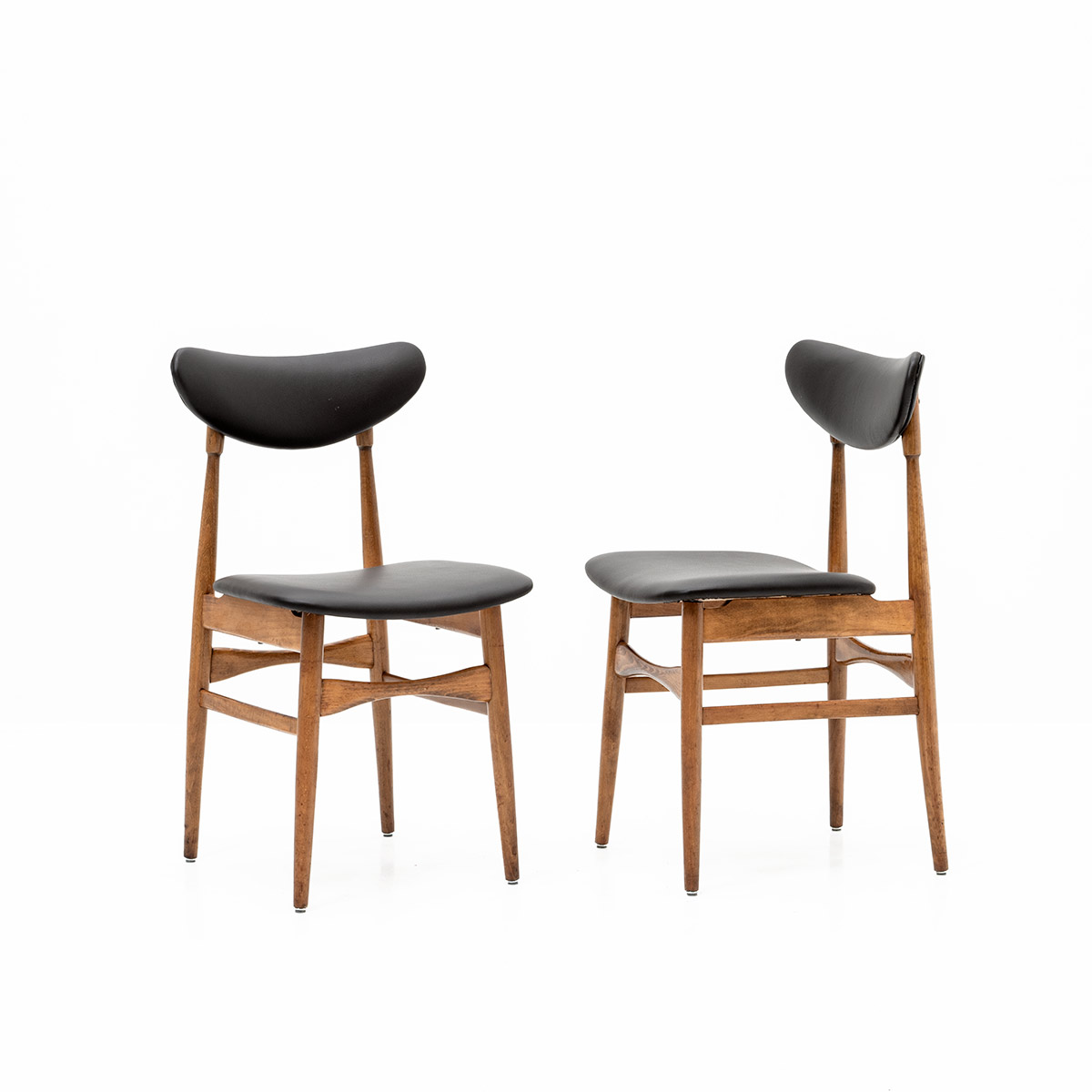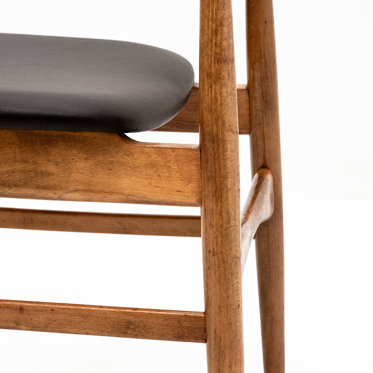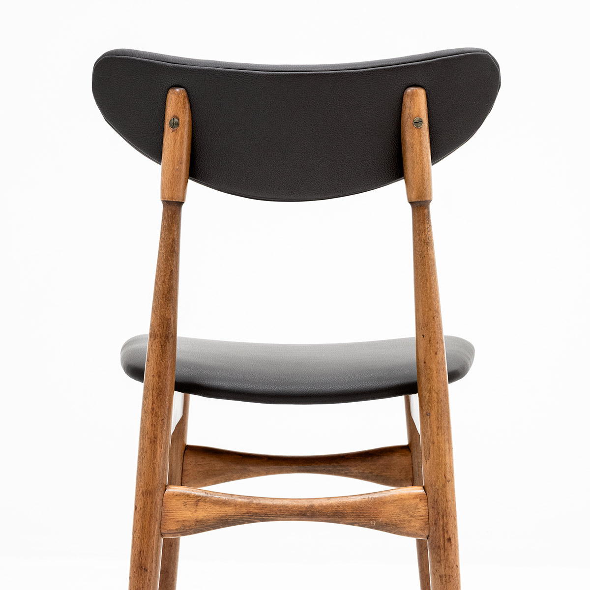 Elegante, Italienische Stühle im skandinavischen Stil. Neu gepolstert mit hochwertigem, schwarzem Leder. Hochwertige Verarbeitung, elegante Details und schöne Patina zeichnen jedes Stück aus. Originalschrauben erhalten – ein zeitloses Vintage-Set.