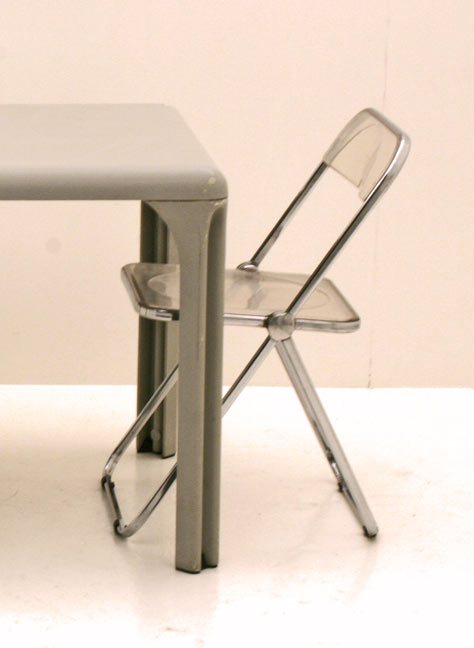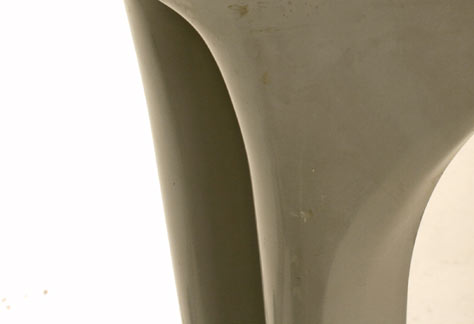 Grau eingefärbter Kunststoff, abnehmbare Beine. Klassiker aus Italien.