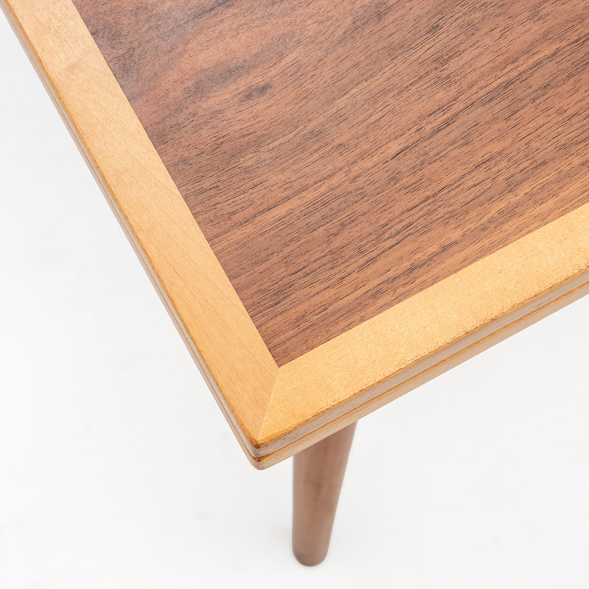 Tischplatte umlaufend mit Ahorn eingefasst.