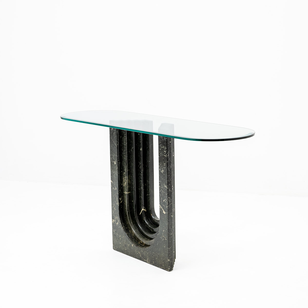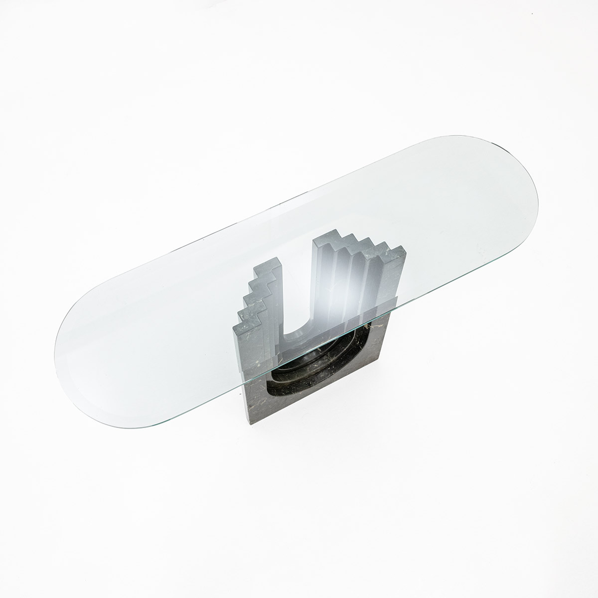 1970er-Jahren mit massivem Marmorsockel und frei aufliegender Glasplatte. Carlo Scarpa für Cattelan Italia.