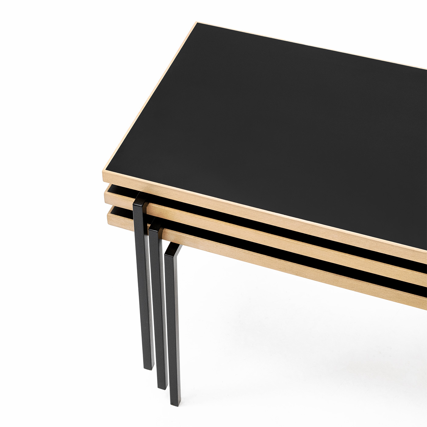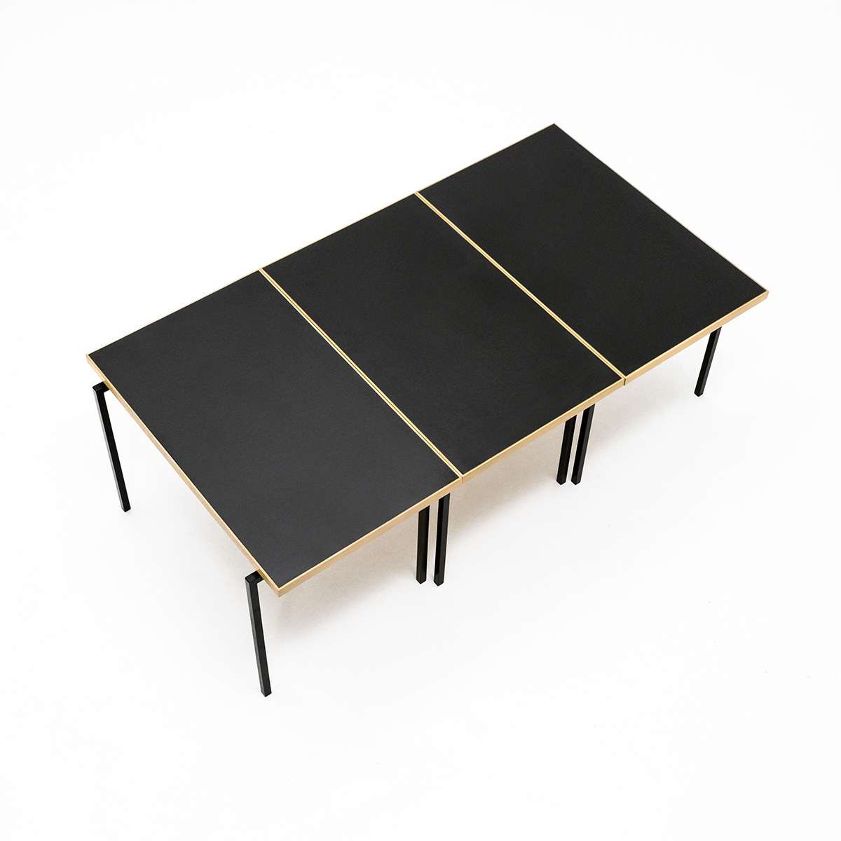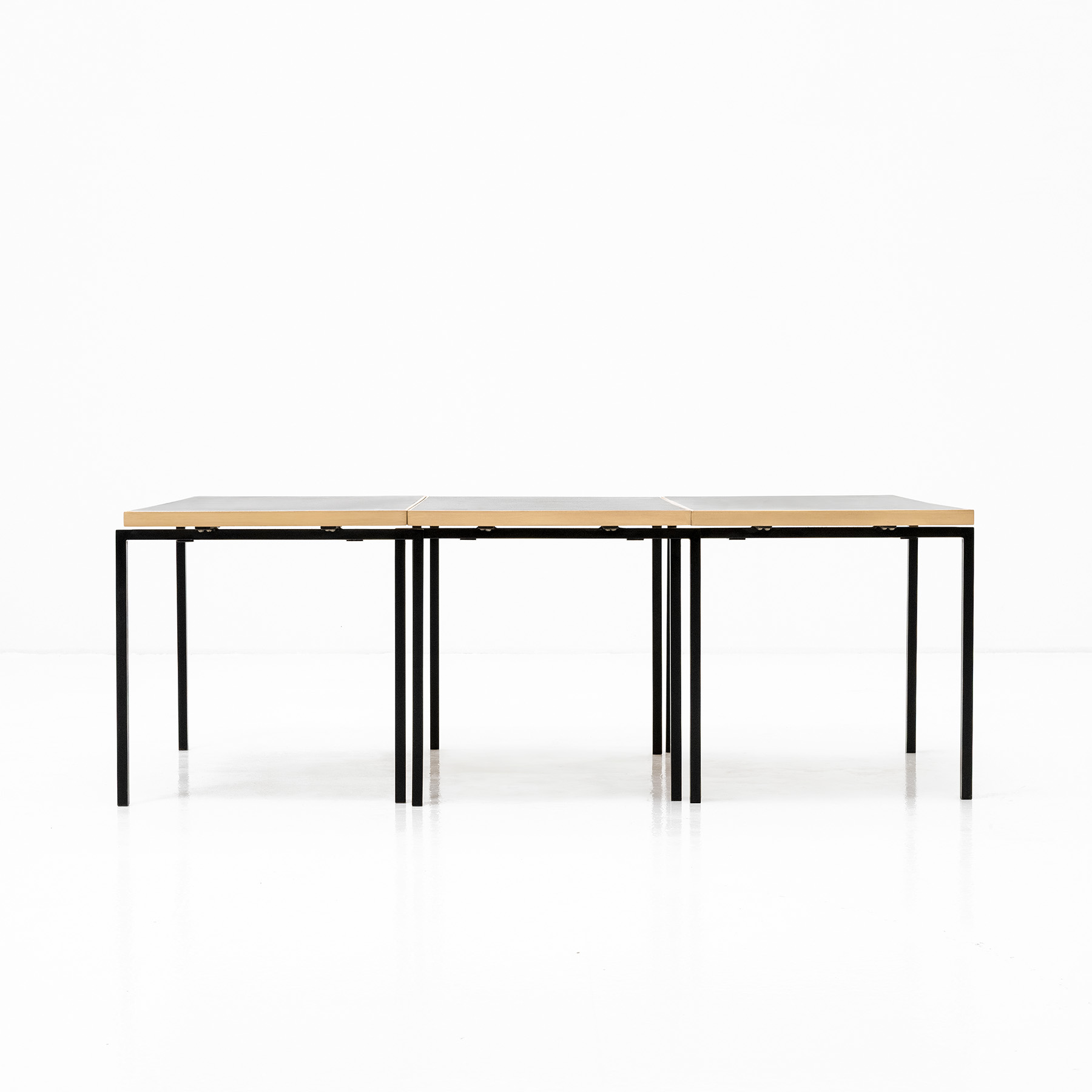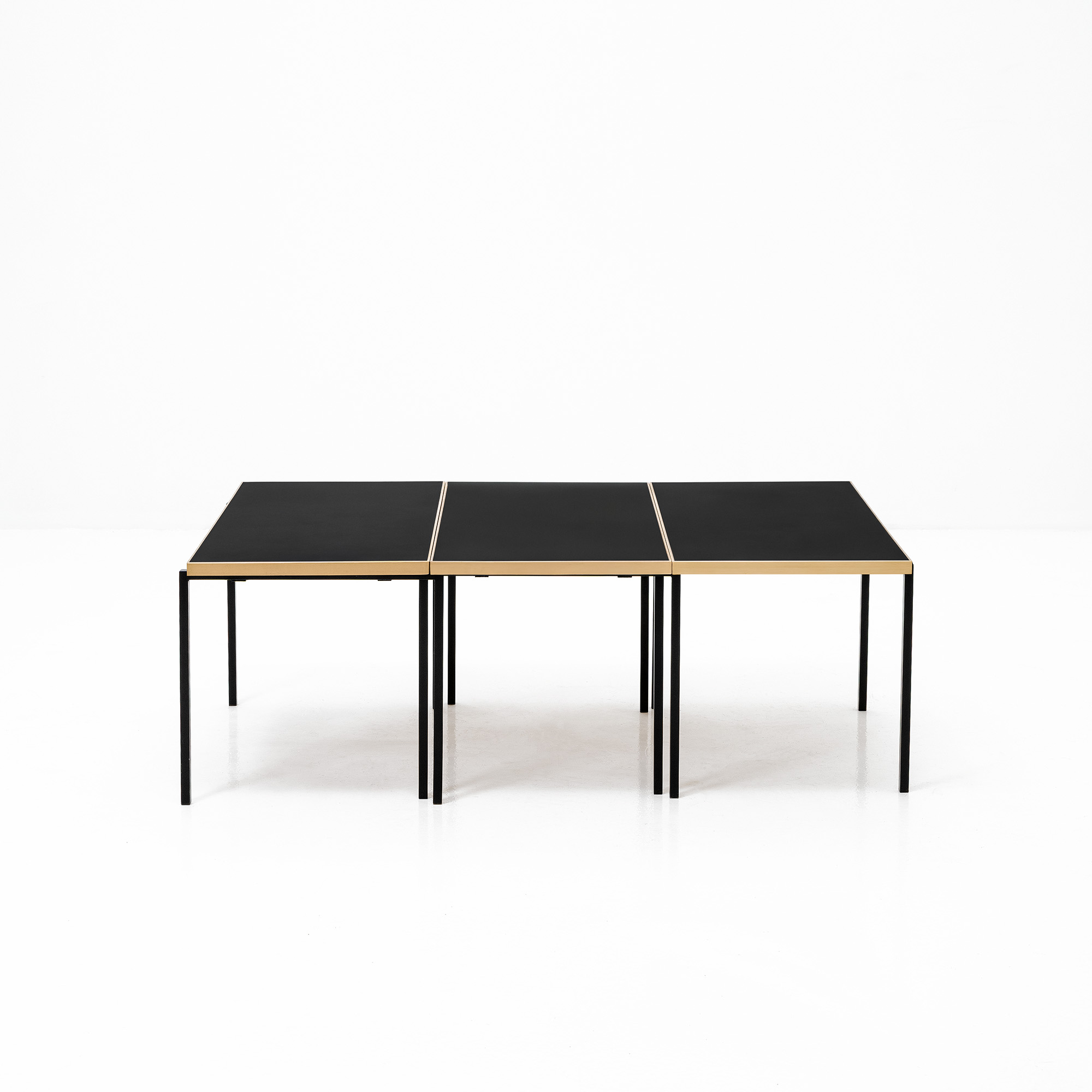 Schnell wurde die Kollektion zum Verkaufs- und Exportschlager, zu der ebenso der Stapeltisch gehörte. Das Modell besteht aus drei in Höhe, Breite und Länge identischen Tischchen mit versetzten Metallbeinen, die in einen länglichen Loungetisch zusammengestellt werden können. Sie lassen sich einfach zerlegen, raumsparend verpacken und einfach versenden.